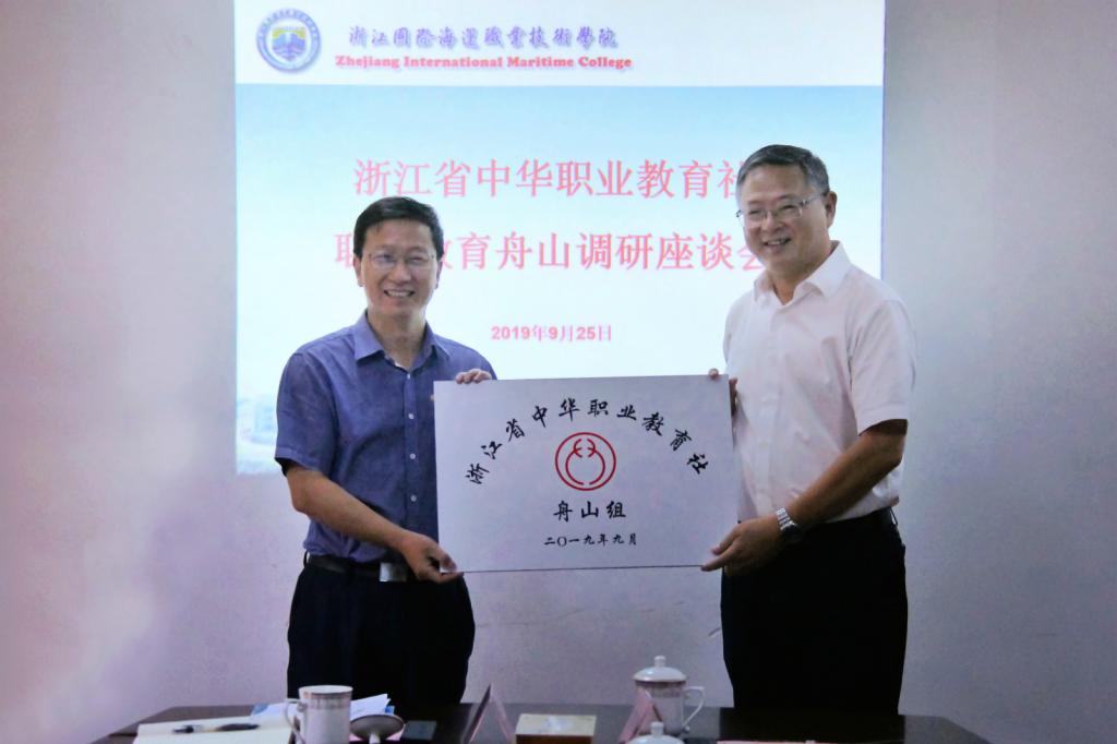 王利月副部长授予“浙江省中华职业教育社舟山组”匾牌,表示浙江省中华职业教育社舟山组正式成立,向我校授予“浙江省中华职业教育社舟山社员之家”匾牌,对我校积极支持中华职业教育社(舟山组)开展工作表示感谢,并希望舟山组团结各党派同志,发挥职教社作用,积极参政议政,献计献策。舟山组(社员之家)要围绕服务社员,提供交流平台,定期交流,同心同力,助力舟山职业教育的发展。