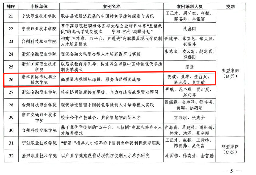 近日,浙江省中华职业教育社、省教育厅和人社厅联合发布《关于2021年浙江省学徒制典型案例评选结果的通知》,全省高职院校共评选了60个典型案例。我校《高质量培养国际海员,服务海洋强国战略》与《绿色石化专业群“双元共育、育训结合、一源多向”的现代学徒制人才培养模式的创新与实践》入选典型案例。