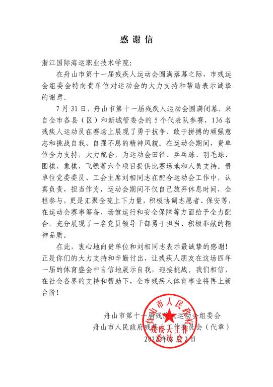 近日,学校收到了舟山市残运会组委会专门发来的感谢信,对我校以及刘相同志对舟山市第十一届残疾人运动会的大力支持和帮助表示诚挚的谢意。