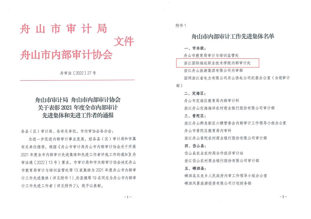 为进一步加强内部审计队伍建设,推动内部审计事业健康发展,舟山市审计局、舟山市内部审计协会开展了2021年度全市内部审计先进集体和先进工作者评选工作。经过申报、推荐、评审并报主管部门批准,在137家单位中评定出13家先进集体和19位先进工作者。我校审计处获2021年度“舟山市内部审计工作先进集体”荣誉称号,这也是继2020年以来,连续两次获此殊荣。