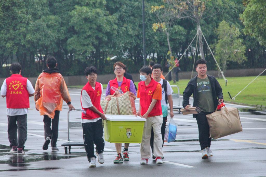 风雨中,志愿者的头发早已被雨水浸得湿透,手里的工作却一刻不停,帮助新生搬运行李。