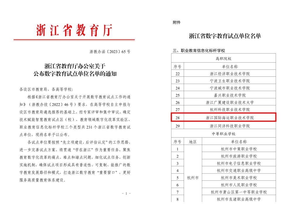 近日,浙江省教育厅发布了《浙江省教育厅办公室关于公布数字教育试点单位名单的通知》(浙教办函〔202365号),我校成功入选浙江省职业教育信息化标杆学校试点单位。
