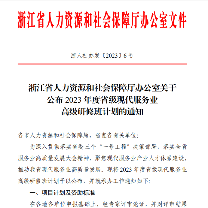 为贯彻落实省委省政府关于高质量发展建设共同富裕示范区的决策部署,聚焦数字经济等重大战略,推动现代服务业高质量发展,浙江省人力资源和社会保障厅在各地各单位申报基础上,经评审会专家论证,确定了2023年19项省级现代服务业高级研修班。