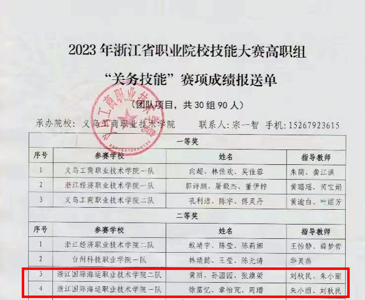 4月23日-24日,由浙江省教育厅主办的2023年浙江省职业院校技能大赛高职组“关务技能”赛项在义乌工商职业技术学院举办。我校由朱小丽、刘秋民老师指导,现代港口贸易学院2021级关务与外贸服务专业黄丽、孙园园、张旗梁、徐菡忆、章怡芃、周璠等6位同学组成的两支队伍,在经过一天半五个比赛模块的激烈比拼后,双双获得团体二等奖,这也是我校代表队第六次在该赛项中获奖。