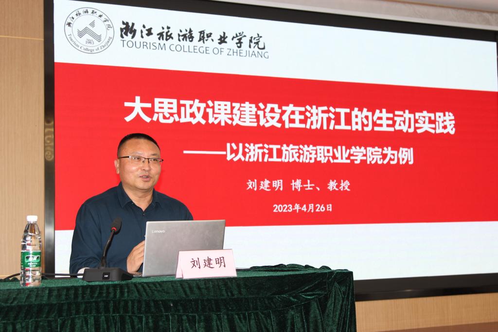 来自浙江旅游职业学院的马克思主义学院院长、浙江省刘建明思想政治理论课名师工作室负责人刘建明教授作了《“大思政课”在浙江的生动实践》辅导报告,他结合多年来在浙江大地开展的“大思政课”、“红色之旅”,介绍了推进校地合作、打造乡土品牌的经历和经验,让与会人员大开眼界。