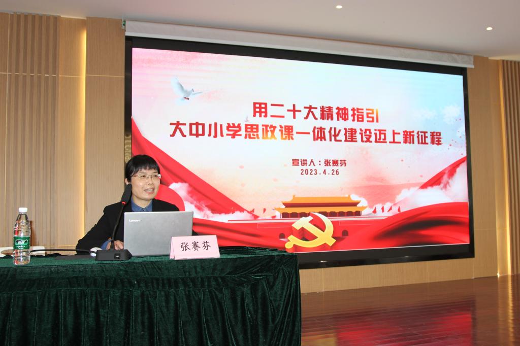 党的二十大代表、全国模范教师、全国优秀班主任、全国师德师风建设专家委员会委员张赛芬,登上被时任浙江省委书记习近平表彰的舟山市定海区皋泄村朱缀绒先进事迹陈列馆的讲台,以《用党的二十大精神指引大中小学思政课一体化迈上新台阶》为题,为全市大中小学校长和思政教师代表上了一堂主题鲜明、内容生动、案例鲜活的思政课。她以“激动、充实、温暖”三个词描述了她的参会感受,用“在蓝领岗位上,也能创造出金领的价值”理念,讲述了她充分运用主题班会课、心理活动课展示、班主任工作坊坐诊等形式,弘扬工匠精神,提升学习积极性,做好学生思想政治工作的体会。