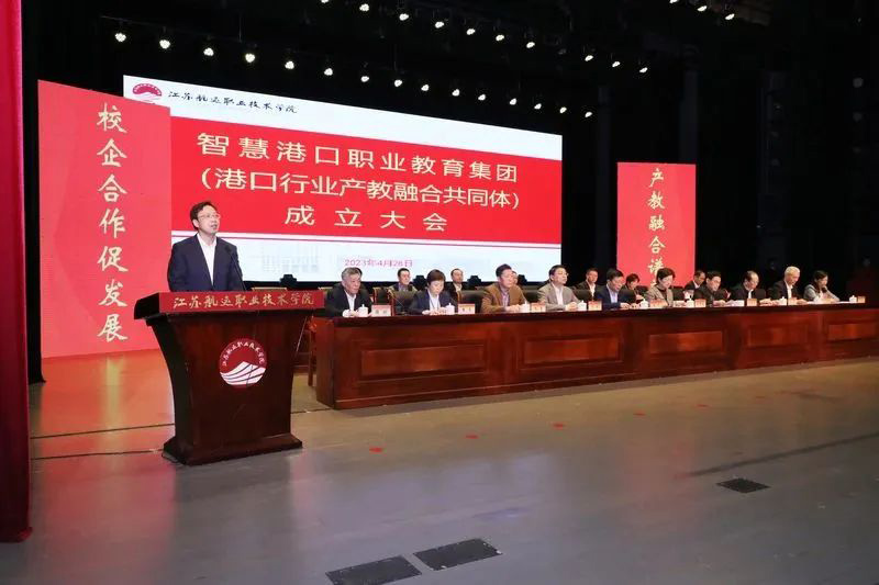 4月28日上午,智慧港口职业教育集团(港口行业产教融合共同体)成立大会在江苏航运职业技术学院举行。江苏省交通运输厅党组成员、副厅长金凌,南通市人民政府副市长陈冬梅,江苏省交通运输职业教育行业指导委员会、江苏省综合交通运输协会、南通市教育局等部门和单位的领导出席大会。我校副校长李丽,海洋装备工程学院党总支书记罗秀峰,教务处副处长陈再发与来自国内相关兄弟院校、港口企业成员单位领导以及近千余名师生代表参加大会。