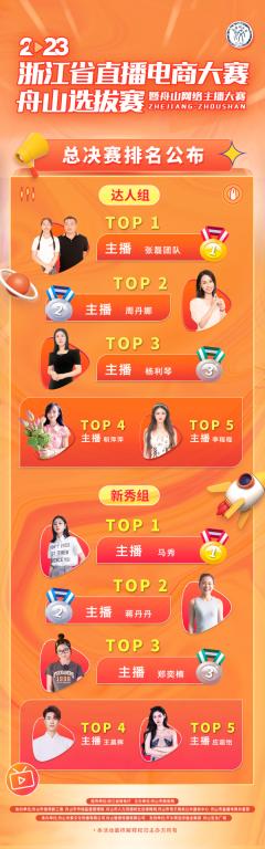在9月9日的总决赛现场,10组决赛选手开启了1小时的带货直播,带货产品来自企业自营、公共选品库、本地团购等。大赛设置了专业评审团,场外评委根据选手的镜头表现、专业能力、直播互动及成交情况等方面进行综合打分,结合带货单数的降分制赋分,按照分数高低决出最终排名。郑奕楠同学不畏强手,作为年龄最小的参赛选手和非专业学生,利用实习期休息时间,边学习边训练,最终获得总决赛第三名,成功入选舟山市电商直播人才库,同时与舟山头部电商企业签署专属直播合约、参与2023线上东海开渔节系列宣传活动。