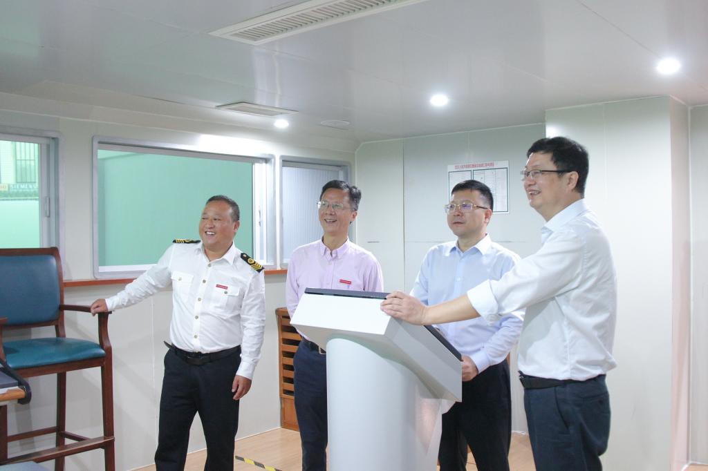 李武杰一行参观了学校航海操纵模拟器、游艇模拟器、轮机模拟器、国家级航海虚拟仿真中心、全国舰船科普教育基地船舶知识馆等,深入了解我校的办学条件、实习实训、人才培养和内涵建设等方面工作开展情况。
