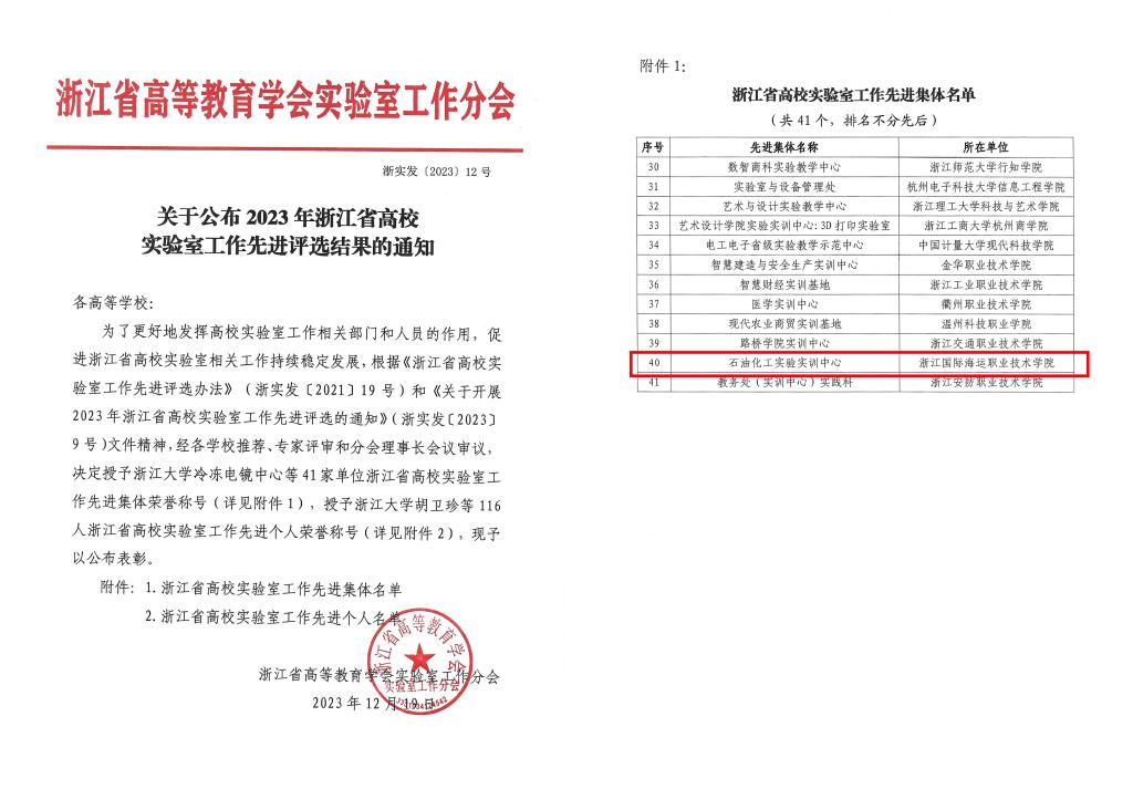 近日,浙江省高等教育学会实验室工作分会公布2023年浙江省高校实验室工作先进和实验室工作研究成果奖评选结果,我校石油化工学院(石油化工实验实训中心)荣获浙江省高校实验室工作“先进集体”。石油化工学院秦传高老师主持的项目《7S管理模式在化工实验实训室管理中的应用》获实验室工作研究成果奖二等奖。