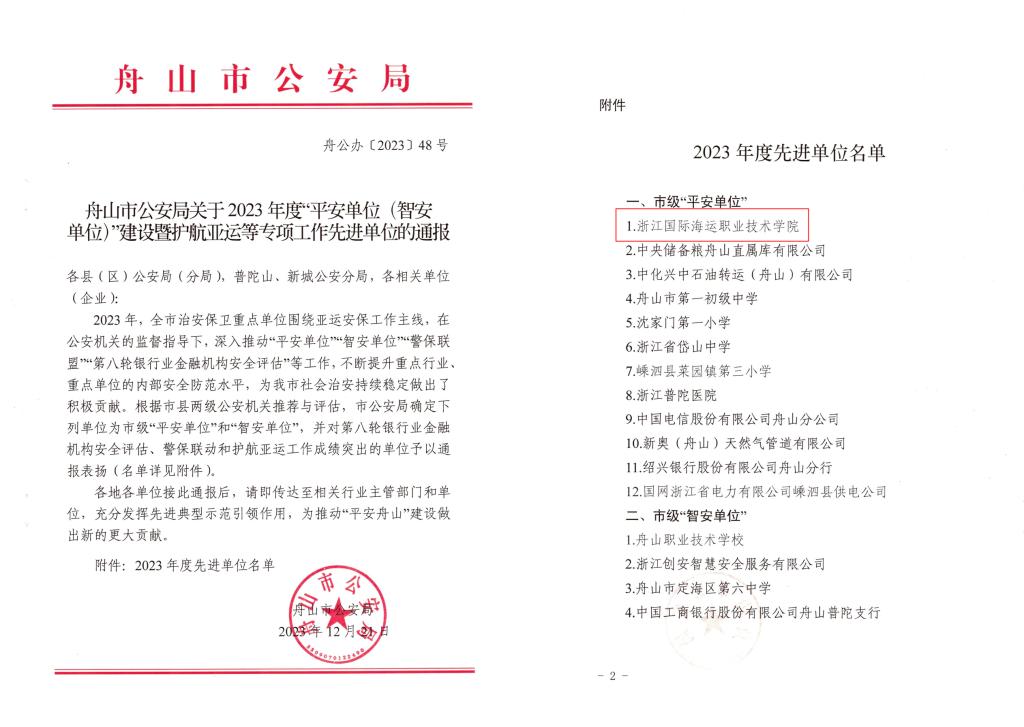 近日,舟山市公安局发出通报,对护航亚运工作等成绩突出,为我市社会治安持续稳定作出积极贡献的单位予以表彰。我校获评市级“平安单位”。