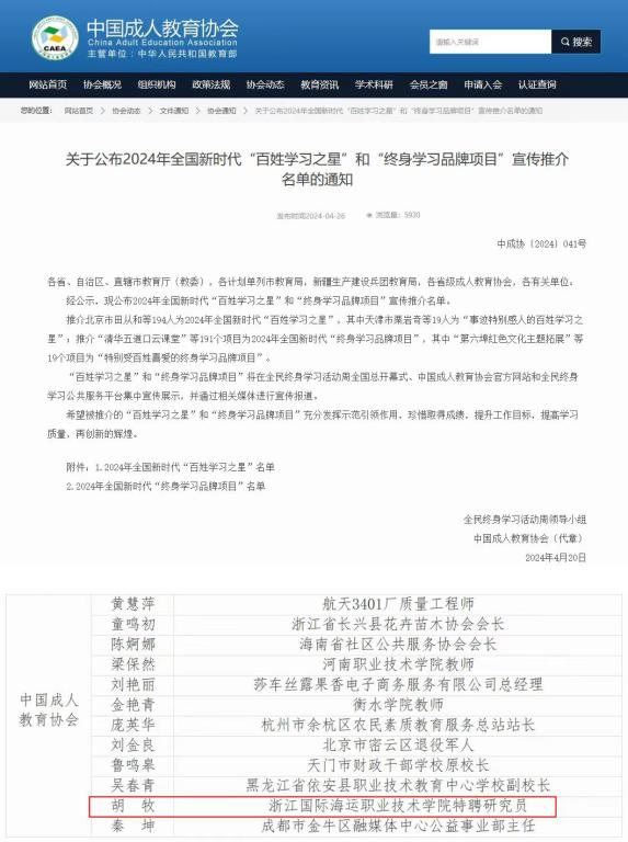 近日,全民终身学习活动周领导小组、中国成人教育协会发布通知,公布2024年全国新时代“百姓学习之星”和“终身学习品牌项目”宣传推介名单。由东海教育学院推荐的“东海智库特聘研究员胡牧”获评“百姓学习之星”,这是继“海上安全与应急体验基地”获评2023年全国新时代“终身学习品牌项目”之后的又一项全民终身学习荣誉。