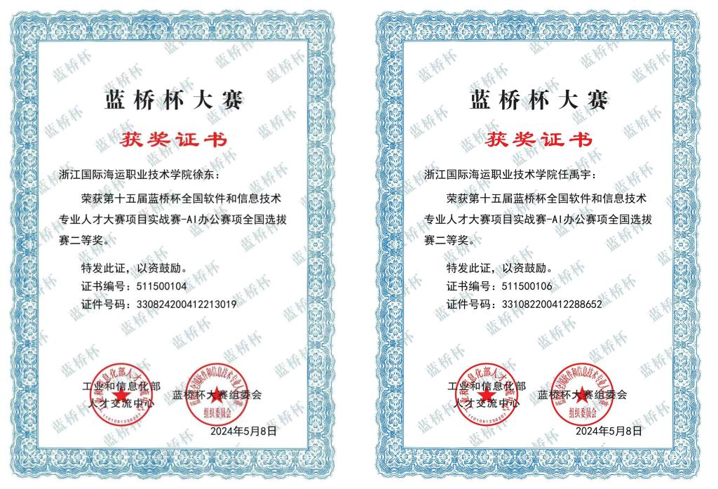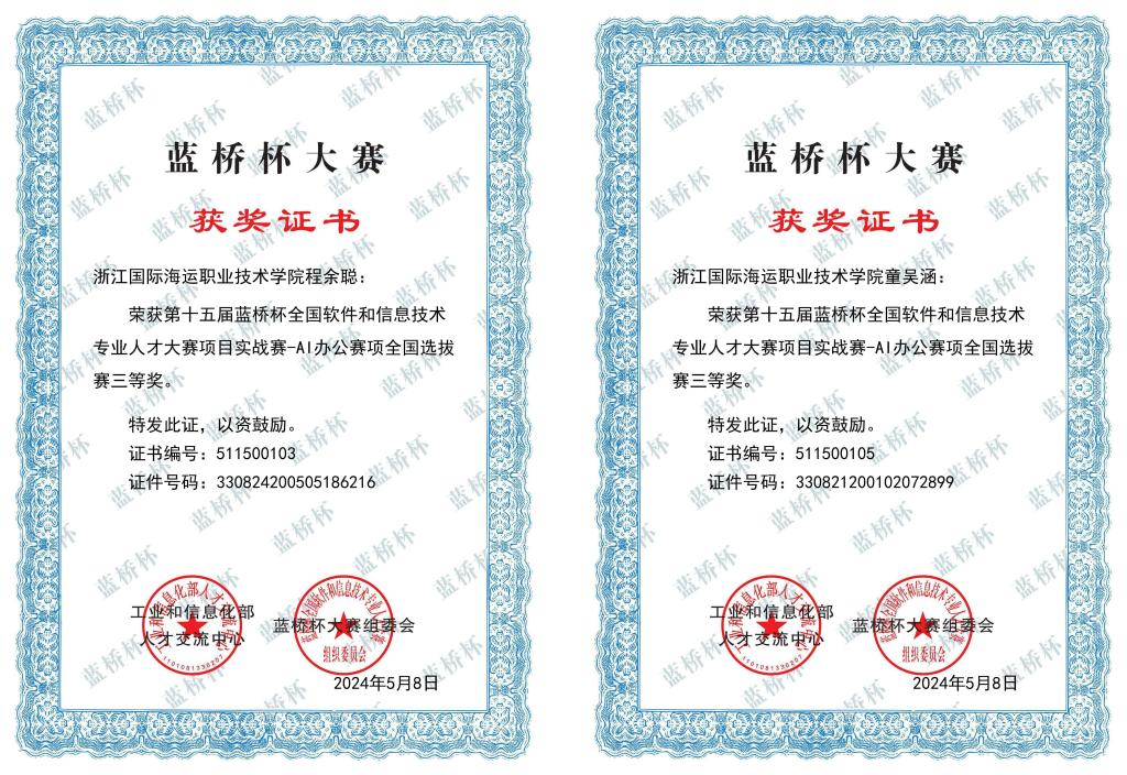 近日,由工业和信息化部人才交流中心主办,国信蓝桥教育科技股份有限公司承办的第十五届蓝桥杯全国软件和信息技术专业人才大赛项目实战赛——AI办公赛圆满落幕。本次比赛吸引了来自全国200余所高校的900多名选手参加,现代港口贸易学院4名学生在比赛中表现出色,取得了优异成绩。