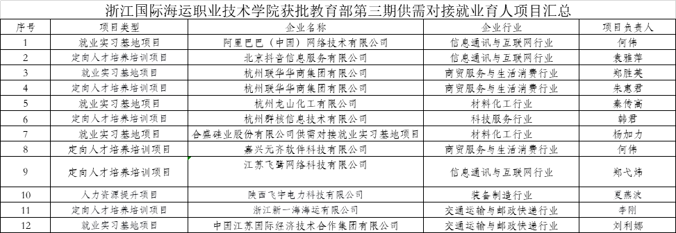 近日,教育部高校学生司发布《关于公布教育部第三期供需对接就业育人项目立项名单的通知》,经校企对接、用人单位申报、专家审核、立项单位信息核查等流程,我校共有12个项目通过审批、获准立项,其中就业实习基地建设5项、定向人才培养培训6项、人力资源提升1项,立项数量实现新的突破。