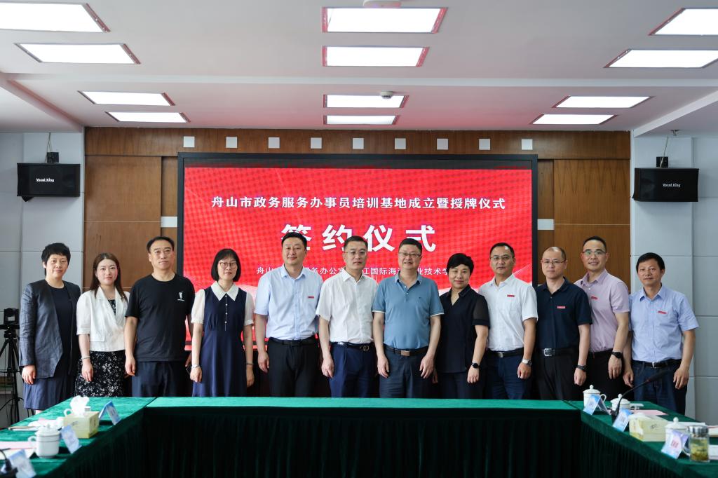 为加快技能人才培养,提高政务服务质量,进一步优化舟山市营商环境,6月28日,舟山市政务服务办事员培训基地在我校挂牌成立,这标志着舟山市在推进政务服务标准化、规范化、专业化的道路上迈出了新步伐。舟山市政务服务办公室党组书记、主任丁伟民,党组成员、副主任孙晓华,校党委书记苏为泽,校党委委员、副校长夏志刚等领导及市政务服务办相关处室长、学校相关部门负责人,参加了基地成立暨授牌仪式。