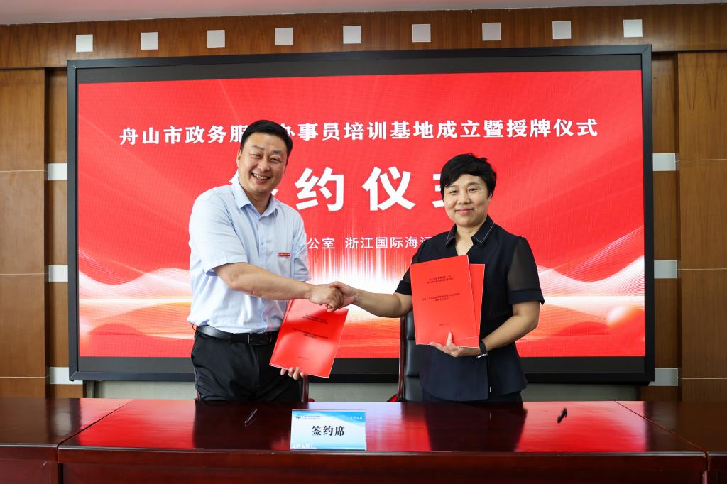 仪式上,苏为泽书记、丁伟民主任分别代表学校和市政务服务办致辞。丁伟民主任为舟山市政务服务办事员培训基地进行授牌,双方签订了战略合作协议。