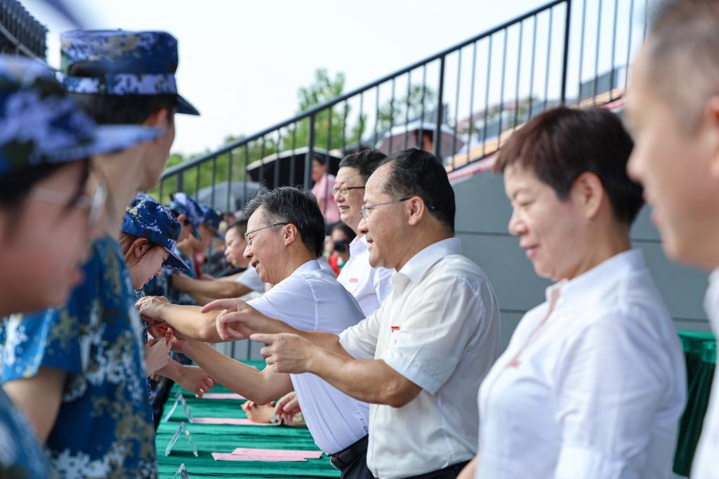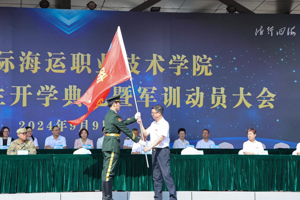 典礼结束后,校党委书记苏为泽为2024级新生军训团授旗,并宣布军训正式开始。