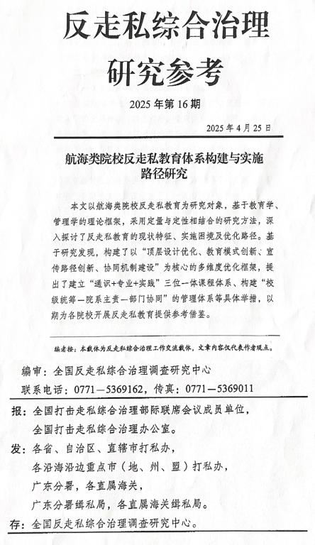 近日,由我校国际教育学院乐冰洁老师主笔的《航海类院校反走私教育体系构建与实施路径研究》获全国反走私综合治理调查研究中心采纳并刊发全国反走私系统。该研究以我校反走私教育实践为基础,深入探讨了航海类院校反走私教育的现状特征、实施困境及优化路径,为全国各地航海类院校开展反走私教育提供了重要参考依据。