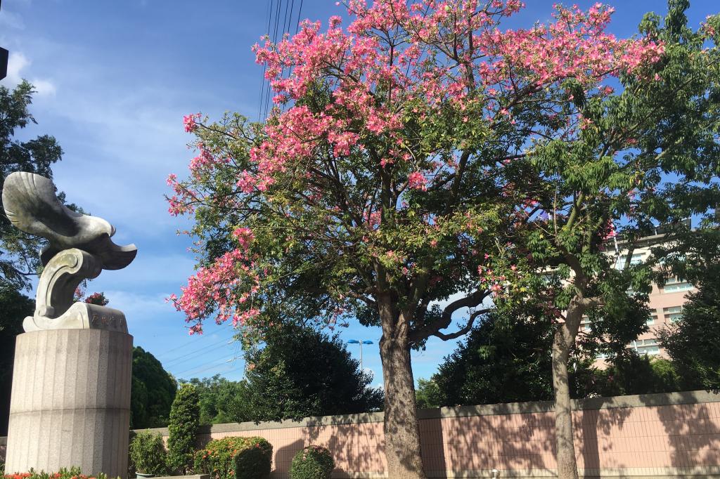 接待的老师专门租赁了一辆双层观光巴士,师生6人边欣赏沿途风景,边和接待老师谈话,在愉快的交流中到达台湾修平科技大学。学校坐落在台中市大里工业区,校园门口一棵盛放的合欢树冲淡了周边厂房和工业区大型供电设施带来的逼仄感,校园不大不新,但是整洁明快。