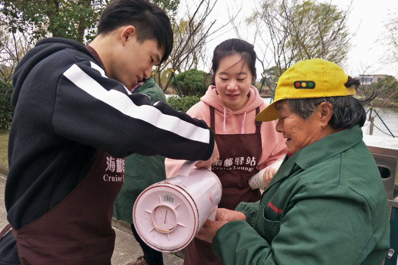 一大早,海洋旅游学院的师生们就忙碌起来,采购红糖、生姜、红枣,在海邮驿站煮姜茶。上午10时左右,攒足了一定数量后,海邮驿站的实习生同学便分头到校园,给校园内的师生志愿者送温暖。