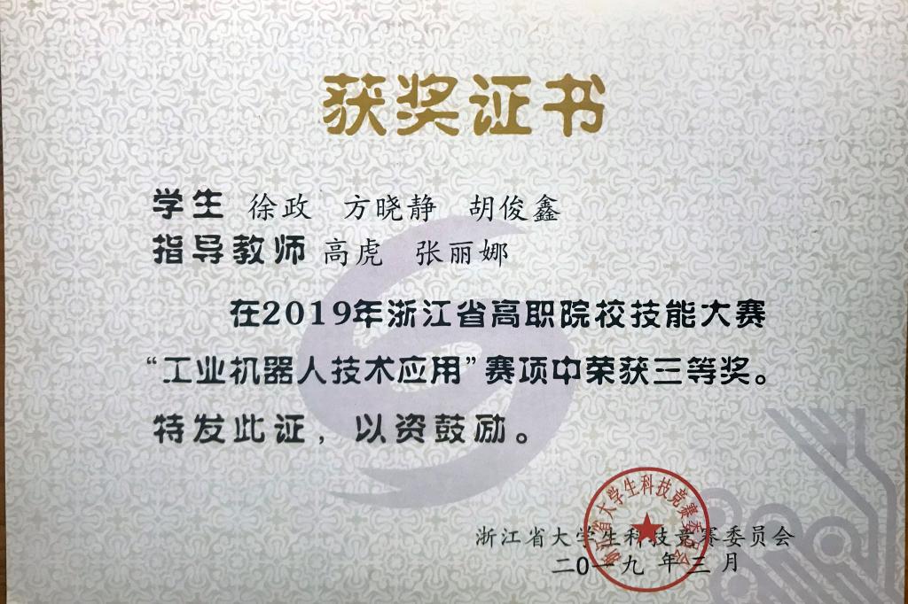 近日,2019年“汇博杯”浙江省高职院校技能大赛暨全国职业院校技能大赛选拔赛“工业机器人技术应用技能”大赛落下帷幕。国际教育学院2017级工业机器人班宋健豪、方晓静、林峰伟,2016级工业机器人班余江、徐政和2018级工业机器人班胡俊鑫组成的两支参赛队均荣获三等奖。我校也是两支队伍均获奖的6所高职院校之一。