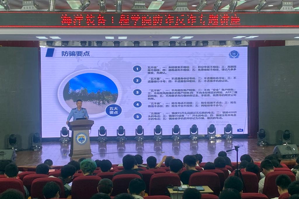 为全面贯彻落实总体国家安全观,增强全体同学的国家安全意识和素养,进一步增强学生反诈防骗意识,全面构筑反诈防线,5月17日,海洋装备工程学院在图书馆4楼报告厅开展了反诈防骗专题讲座。市反诈中心叶晞警官、张德麒警官,市反诈联席办谢国栋警官,新城反诈中心谢乐警官,招商银行舟山分行总经理梁江晨,运营管理总经理吕霄、风险部总经理姚彤应邀出席讲座。海洋装备工程学院党总支书记罗秀峰、党总支副书记於国元和学院全体辅导员,大一、大二所有在校生参加讲座。
