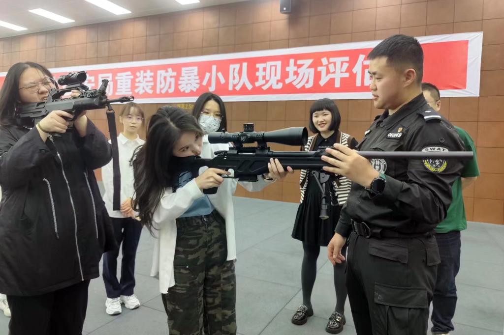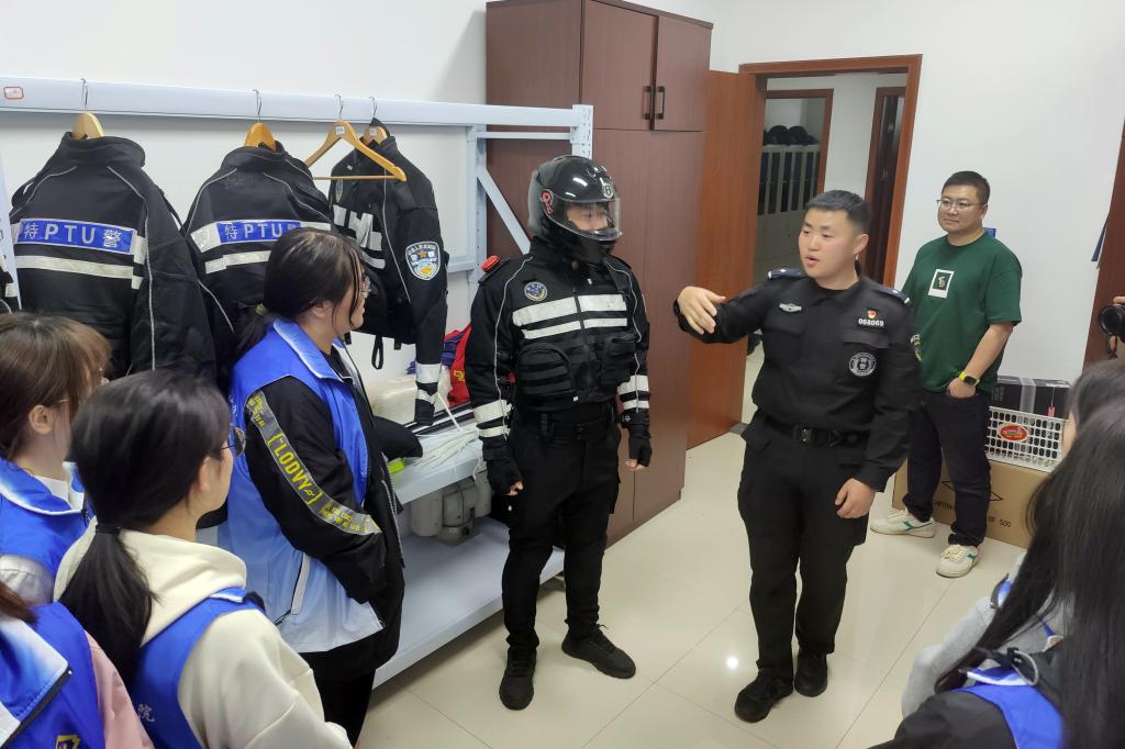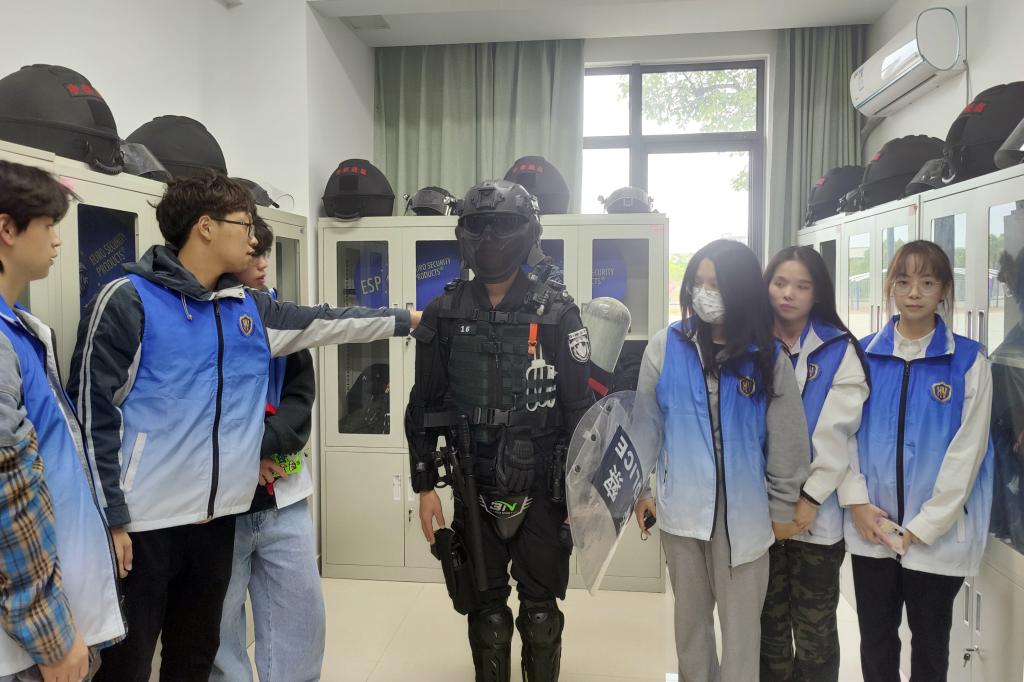 在参观警用装备时,教导员逐一介绍了各种警用防护装备及处突装备的性能、作用和使用方法,让学生们亲身进行了体验和感受。