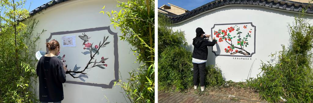 虽然烈日暴晒、蚊虫叮咬,但同学们不畏艰苦,经过精心设计和绘制,完成了40多幅富有浓郁乡土气息的水墨花鸟画作品。这些乡土风格的绘画作品不仅丰富了乡村文化内涵,也将乡村振兴的美好蓝图展现在村民面前。