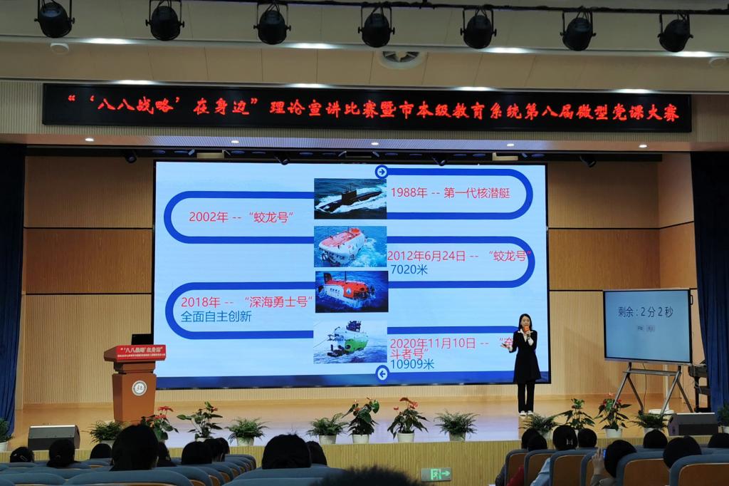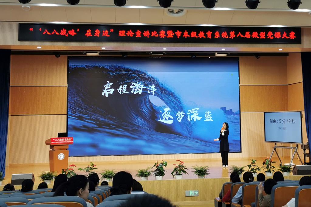 本届微型党课大赛由中共舟山市教育局委员会举办,共有来自全市幼儿园、中小学、中高职院校的30名优秀党员教师参加现场比赛。在比赛现场,教师们以“‘八八战略’在身边”为主题,聚焦“创新深化”“改革攻坚”“开放提升”,以身边人、身边事,深情阐述了20年来在“八八战略”指引下的发展故事、奋斗故事。我校陈星蓉老师以《启程海洋,逐梦深蓝》为题,讲述了我国探索海洋的创新步伐,赢得了评委和观众的好评。(宣传部)