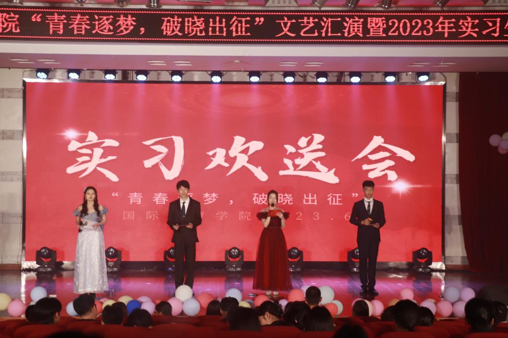 为了给即将奔赴实习岗位的同学们提供一个和老师、同学交流及展现自我的舞台,留下美好的青春记忆,同时表达学院领导、老师对实习生们的美好祝愿,国际教育学院6月2日举办了“青春逐梦,破晓出征”文艺汇演暨2023年实习生欢送会。校党委副书记孔志光,国际教育学院党支部书记、院长吴旭光及学院老师们应邀到场观看。
