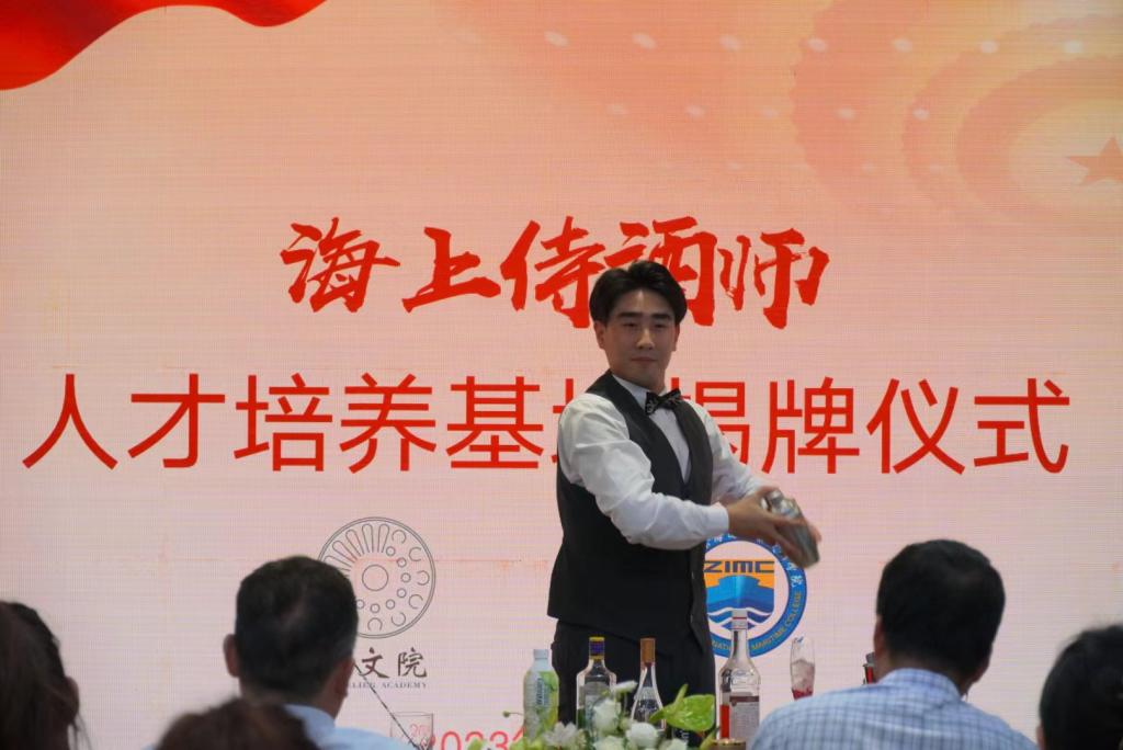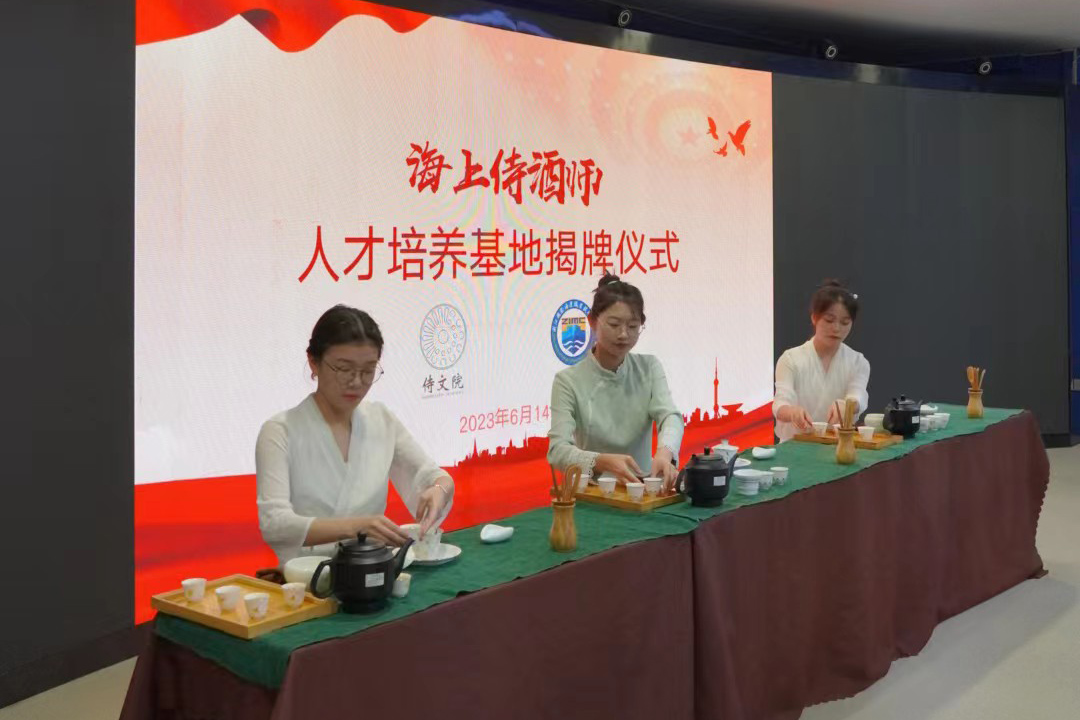 仪式上,海洋旅游学院的学生还进行了茶艺、插花、酒水和咖啡服务现场表演。李航作了院校侍酒师分享课,他围绕侍酒师行业发展现状、政府给予侍酒师行业的各项政策、“海上侍酒师”落地培养思路作详细讲解,对人才培养基地的各项职责及即将开展的各项业务作了规划。