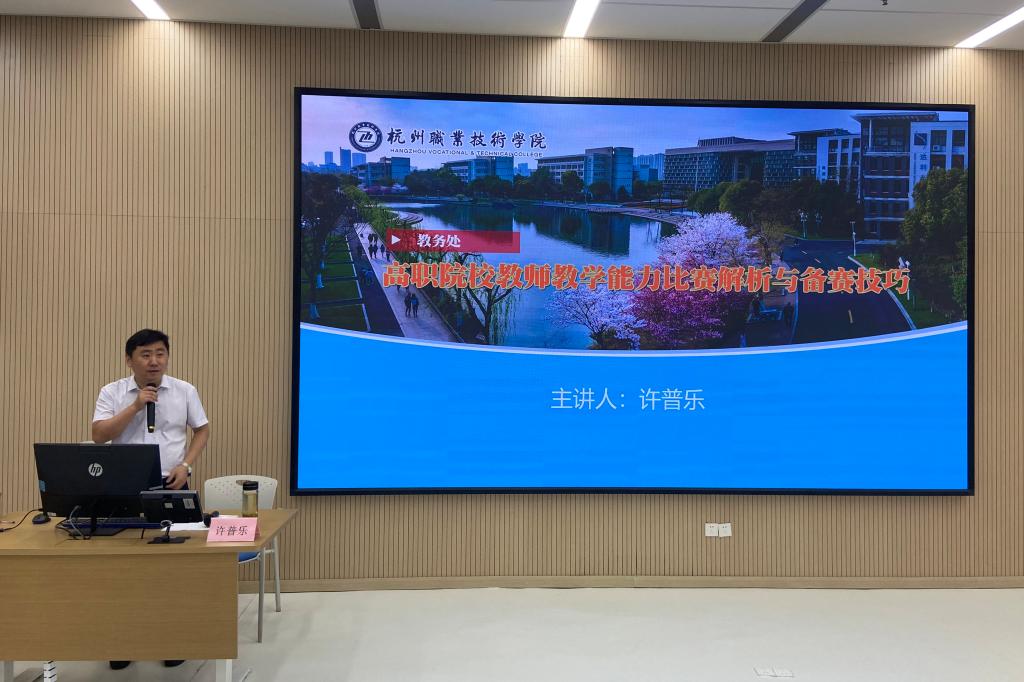 来自杭州职业技术学院的许普乐教授作了题为《高职院校教师教学能力比赛解析与备赛技巧》的讲座,他从“背景”、“比赛规则”、“备赛建议”、“心得体会”等四方面深入浅出地讲解了关于教师教学能力比赛的一系列问题,许教授的讲座使在座新进青年教师对教师教学能力比赛有了初步的印象,也在大家心中种下了参加教学能力比赛的种子。