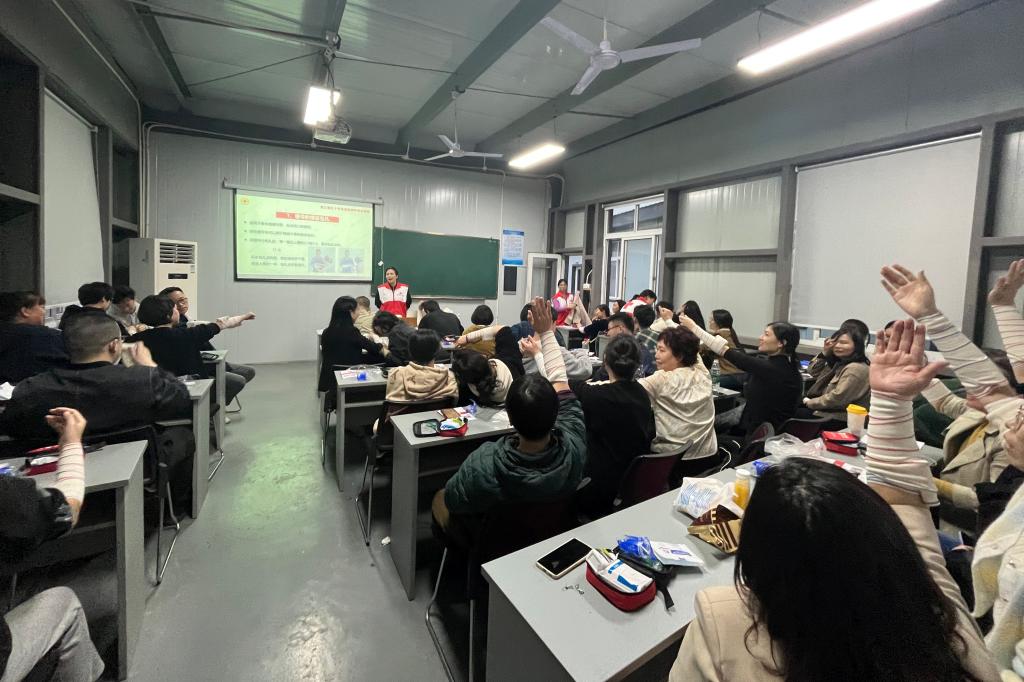 4月10日、13日,校红十字会聘请了多名老师与本校救护师资一起为教职工和学生寝室长进行了应急救护培训。培训中,先讲解了气道异物梗阻急救及心肺复苏+AED使用、创伤救护技术等急救理论知识,随后在救护师资陈晓燕、张红叶、乐意婷、蒋朝进等带领下,分组进行了实操练习。每个学员都在模拟人身上多次演练胸外按压、人工呼吸及AED操作,相互练习绷带包扎、三角巾包扎、骨折躯干固定等止血包扎固定方法。