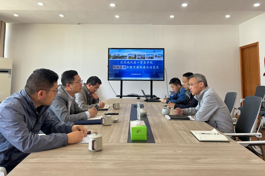 4月24日,现代港口贸易学院党总支书记李刚带领副院长柏昌顺以及数字媒体艺术设计专业团队长韩君一行三人到舟山航海学校,就党建联建共促专业建设与舟山航海学校党委书记王松杨及相关负责人进行深入交流。此次交流旨在加强两校间的党建联建工作,推动专业建设水平的提升,并共同探索中高职一体化合作专业的建设途径。