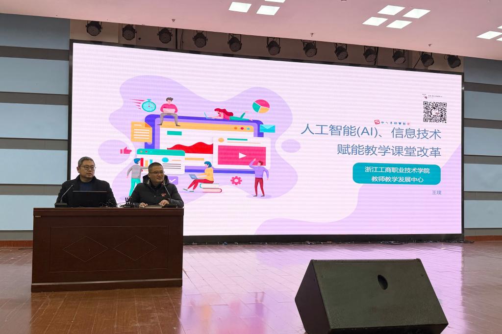 本次教师培训第一课由浙江工商职业技术学院王璞老师作《AI赋能课堂教学创新》专题讲座。讲座紧紧围绕如何运用AI大模型提升教师教学能力这一关键问题,从AI制作PPTAI助力文档写作、AI制作图片、AI虚拟仿真、AI数据分析等方面对国内主流的AI大模型进行了全面深入的解读。在讲座过程中,王璞老师时不时穿插一些与广大教师密切相关的案例,如AI美化PPT技术、AI撰写教案技术、智能体及教学辅助开发技术等,诙谐幽默的案例赢得了在场广大教师热烈的掌声。讲座末尾,王璞老师还慷慨地分享了自己积累许久的AI大模型网址,为提升广大教师的AI应用水平提供了强大助力。