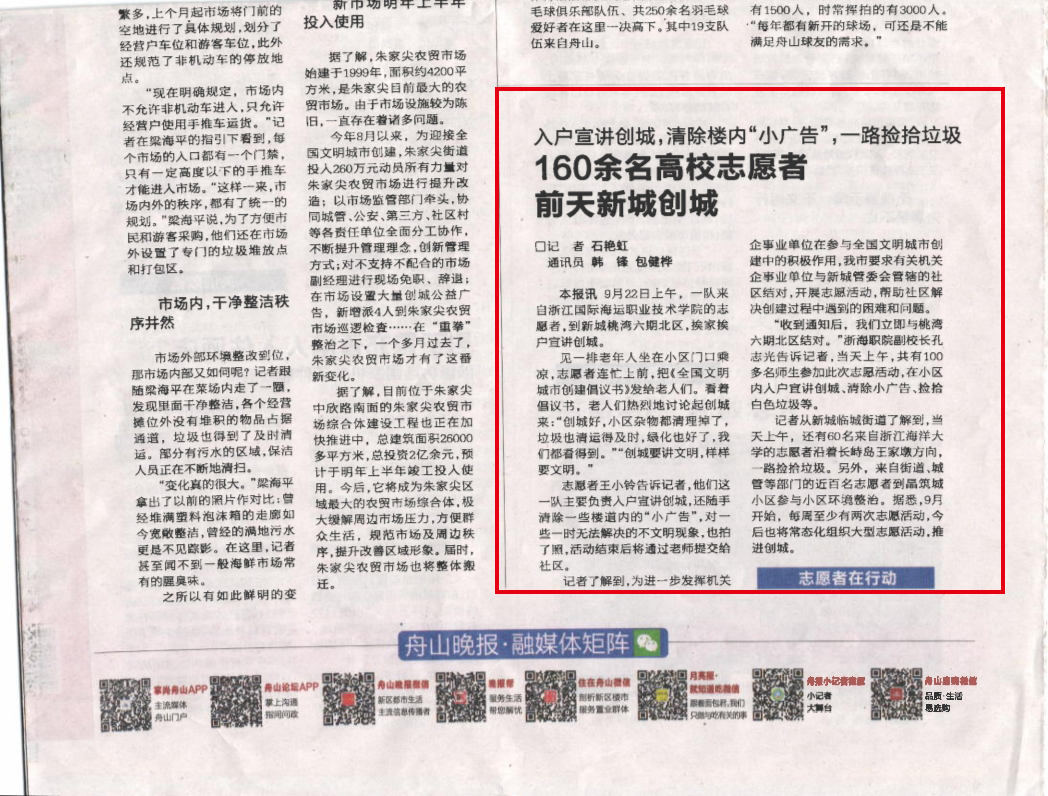 记者从新城临城街道了解到,当天上午,还有60名来自浙江海洋大学的志愿者沿着长峙岛王家墩方向一路捡拾垃圾。另外,来自街道、城管等部门的近百名志愿者到晶筑城小区参与小区环境整治。据悉,9月开始,每周至少有两次志愿活动,今后也将常态化组织大型志愿活动,推进创城。