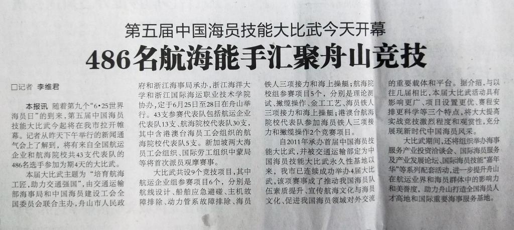 随着第九个“6▪25世界海员日”的到来,第5届中国海员技能大比武今起将在我市拉开帷幕,记者从昨天下午举行的新闻通气会上了解到,将有来自全国航运企业和航海院校共43支代表队的,486名选手参加为期4天的大比武。