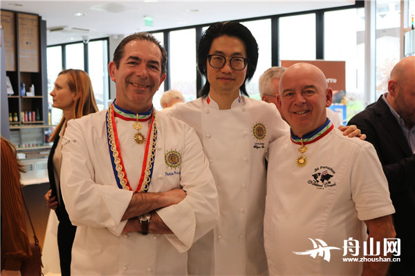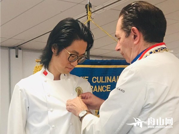 法国当地时间2月22日下午,法国餐饮学会在巴黎蓝带厨艺学院举行授勋仪式,来自浙江舟山的鲍飞跃,从学会主席Fabrice Prochasson手中接受入会勋章和证书,成为首位加入法国餐饮学会的中国籍主厨。