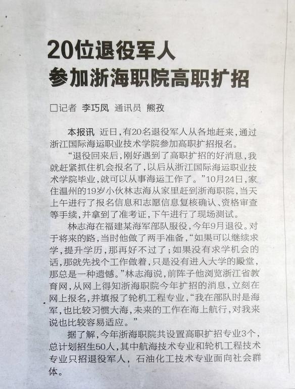 林志海在福建某海军部队服役,今年9月退役。对于将来的路,当时他做了两手准备,“如果可以继续求学,提升学历,那再好不过了;如果没有求学机会的话,那就先找个工作做着,只是没有进入大学的殿堂,那总是一种遗憾。”林志海说,前阵子他浏览浙江省教育网,从网上得知浙海职院今年扩招的消息,立刻在网上报名,并填报了轮机工程专业,“我在部队时是海军,也比较习惯大海,未来的工作在海上航行,对我来说也比较容易适应。”