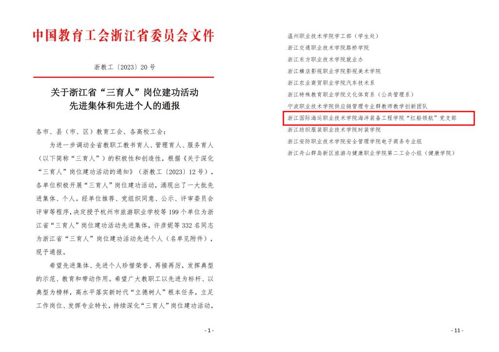 9月1日,浙江省教育工会发布了《关于浙江省“三育人”岗位建功活动先进集体和先进个人的通报》,我校海洋装备工程学院“红船领航”党支部荣获浙江省“三育人”岗位建功活动先进集体称号。