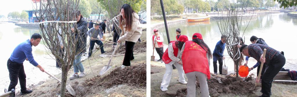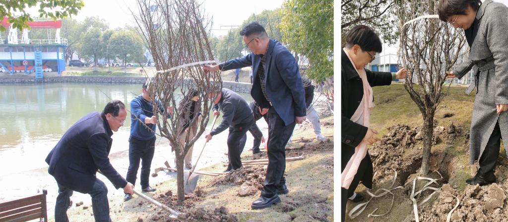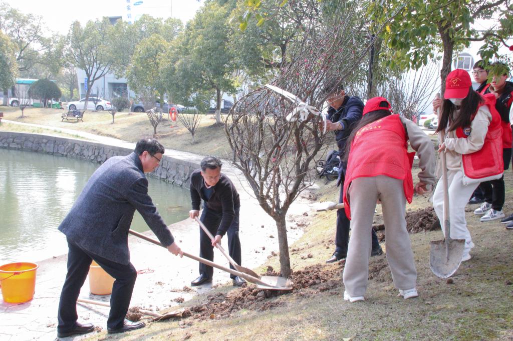 活动现场,大家分工协作、干劲十足,挥锹培土,合力栽下梅树,铲土、培土、浇水……校园湖边奏响“春之序曲”。