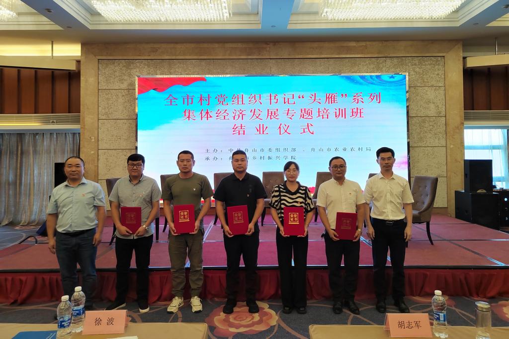 为进一步提升渔农村基层组织建设水平和村干部队伍的整体素质,增强村干部带动发展和带领群众致富的能力,助推全市农业农村高质量发展,710-14日,由舟山市委组织部、舟山市农业农村局主办,舟山市乡村振兴学院承办的全市村党组织书记“头雁”系列第四期集体经济发展专题培训在定海举行。市农业综合行政执法队专职副队长、市乡村振兴学院副院长刘丽,我校党委委员、副校长、市乡村振兴学院执行副院长夏志刚出席开班仪式,来自各县区、管委会共计40名村党组织书记参加本次培训,开班仪式由舟山市乡村振兴学院副秘书长兼培训部部长苏峰主持。